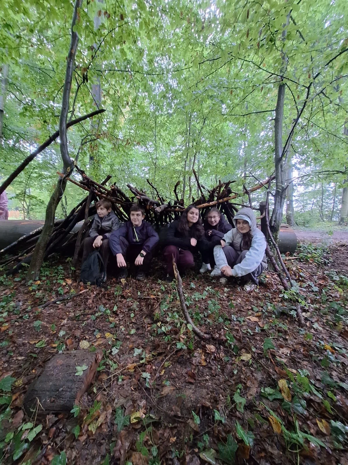 Am nächsten Tag stand ein Hüttenbau-Projekt auf dem Plan. In kleinen Gruppen bauten wir im nahegelegenen Wald eigene Unterstände aus Naturmaterialien. Trotz Regen und Wind ließen wir uns die gute Laune nicht verderben – im Gegenteil: Das Wetter machte die Aufgabe nur noch spannender. Mit Teamwork, Kreativität und Durchhaltevermögen entstanden ganz unterschiedliche Hütten, auf die wir sehr stolz waren.